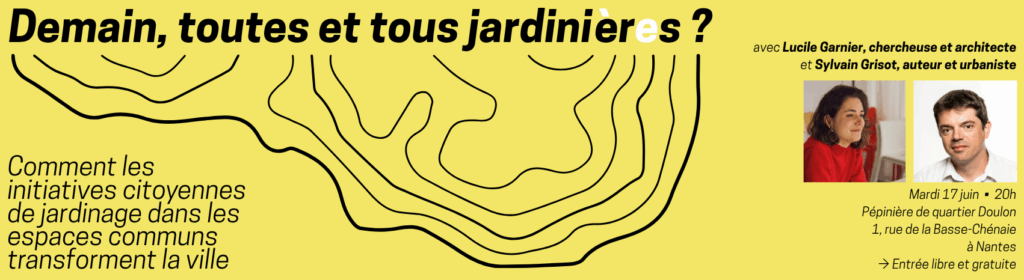 → Une conférence pour croiser les regards entre écologie, urbanisme et action citoyenne ; → Une discussion pour observer ces nouveaux rapports à la ville et découvrir comment ils transforment la fabrique urbaine et ouvrent d’autres façons de faire ensemble, à l’échelle d’une rue ou d’une ville ; → Une soirée pour toutes celles et ceux qui jardinent déjà… les mains dans la terre ou dans leur tête !
