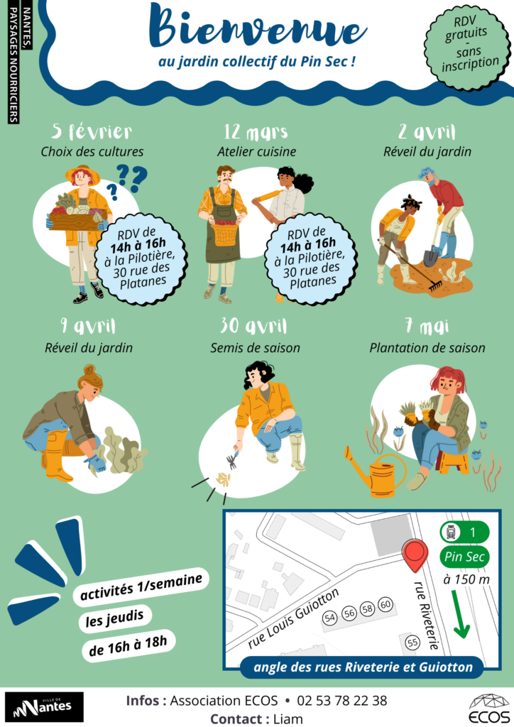 - Rendez-vous bimensuels au jardin les jeudis après-midi avec Liam, contact[@]ecosnantes[.]org
